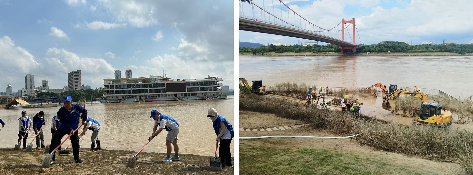 洪水退去,重建提速。10月12日邕江水位降至警戒线下,协会会员企业迅速转入“水退人进”清淤攻坚。中交一公局四公司再展“急先锋”本色,提前备足1200吨石料,19台重卡50分钟内完成调度、装车、送达全流程,更调派大型设备在民生码头等重点区域高效作业;各企业组建专项队伍,严守“先通风、再检测、后作业”规范,同步落实防溺水、设备检修等措施,实现清淤效率与安全生产“双保障”。