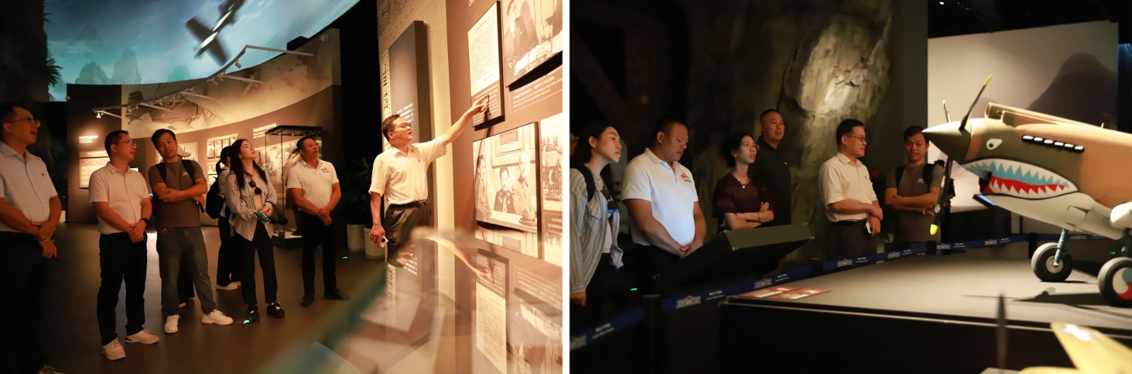 9月26日下午,协会党委一行抵达柳州飞虎队纪念馆,一架按1:1比例复刻的P-40战斗机模型率先映入眼帘,机身标志性的“鲨鱼嘴”涂装瞬间将大家带回战火纷飞的抗战年代。大家沿着 “援华抗日・飞虎入柳”“空中屏障・保卫柳州”“飞虎精神・代代相传”三大展区缓缓前行参观。泛黄的作战地图上,密密麻麻的航线标注着飞虎队队员们的战斗轨迹;玻璃展柜中,保存完好的飞行员皮夹克、电台设备、作战日志等实物,无声诉说着当年中美盟军并肩作战的热血故事。大家驻足凝视展区内的影像资料,不少人拿出手机记录历史瞬间。他们互相细语道:以前只在课本里了解过飞虎队,今天看到这些实物和故事,实在令人震撼,深切感受到先烈们的勇敢与担当,这种爱国精神值得我们永远学习。